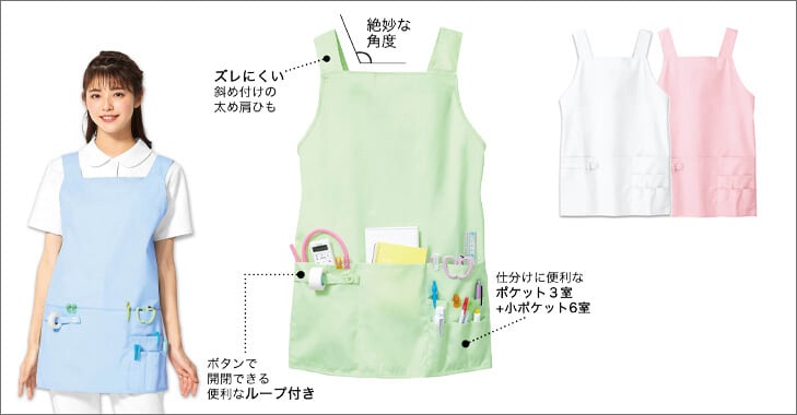 実はエプロンは道具入れの役割も担ってくれます。ノートが入る大型のポケットからペン差し、サージカルテープが通せるループ付きのものまで。現場で必要なものがサッと取り出せるエプロンが揃っています。