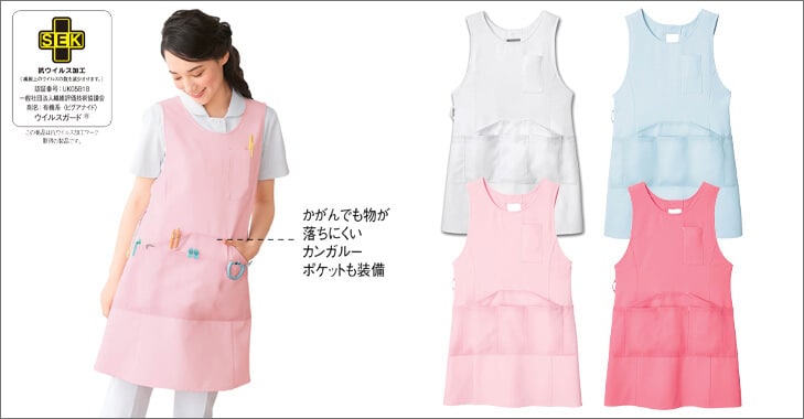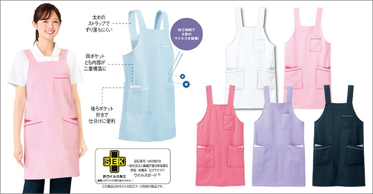 業界初の抗ウイルス加工を施した生地で、ウイルスを99.9%撃退するエプロンです。
