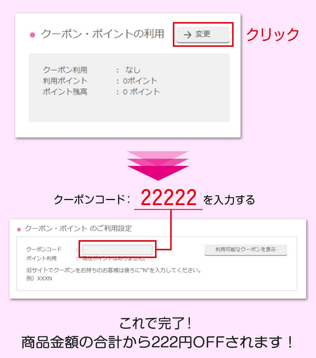 ※クーポンコードをお控えの上、「ご注文内容確認」ページのクーポンコード入力欄にいれてください。