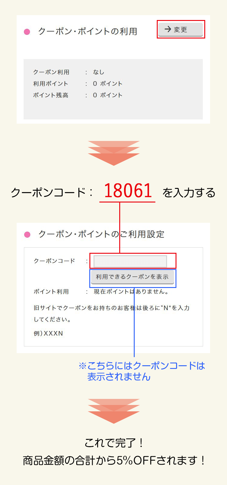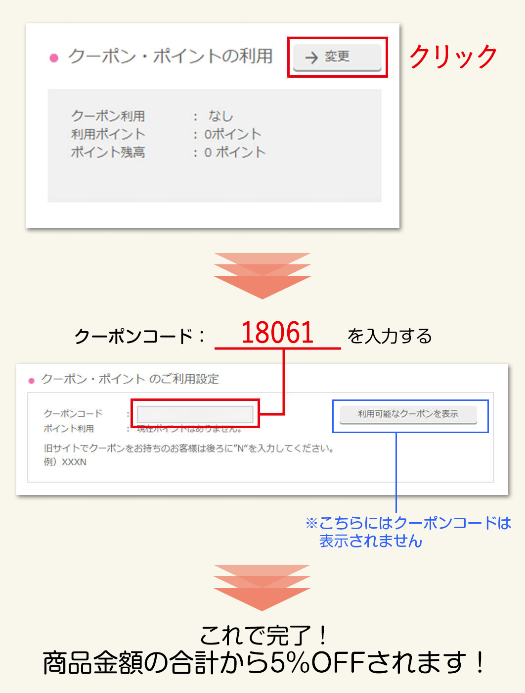 ※ クーポンコードをお控えの上、「ご注文方法設定」ページのクーポンコード入力欄に手入力でいれてください。