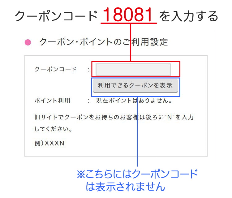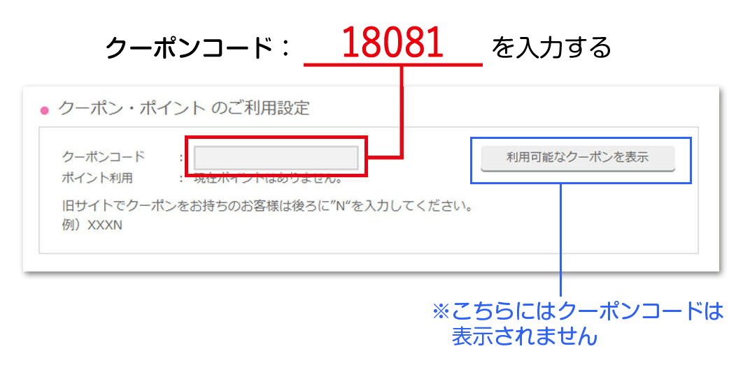 ※ クーポンコードをお控えの上、「ご注文方法設定」ページのクーポンコード入力欄に手入力でいれてください。