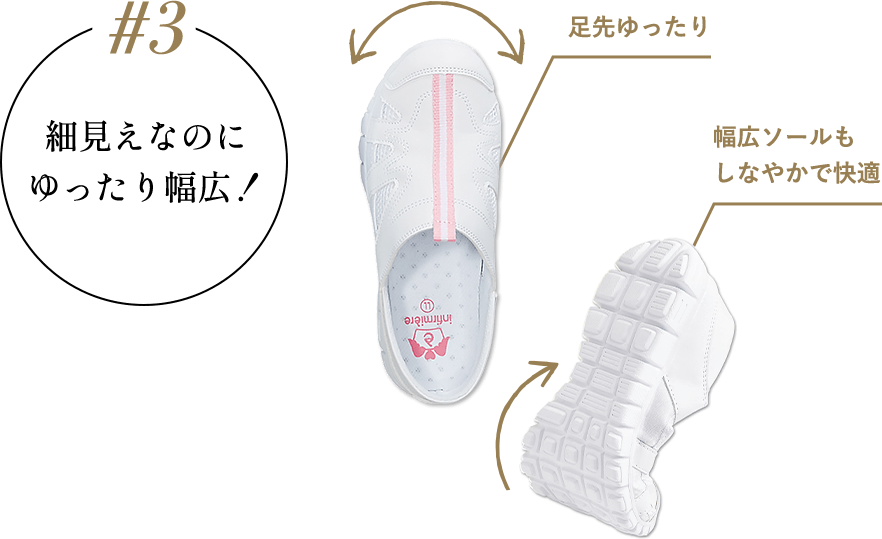 甲高、幅広で靴選びが難しいのですが、足に負担無く、ゆったりした履き心地で、ワンサイズ下げました。仕事で履くのでオール白も気に入ってます。出来たらインソールを選べたら更に嬉しいです。