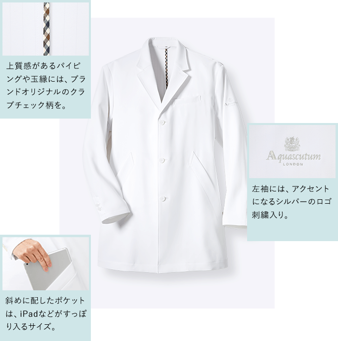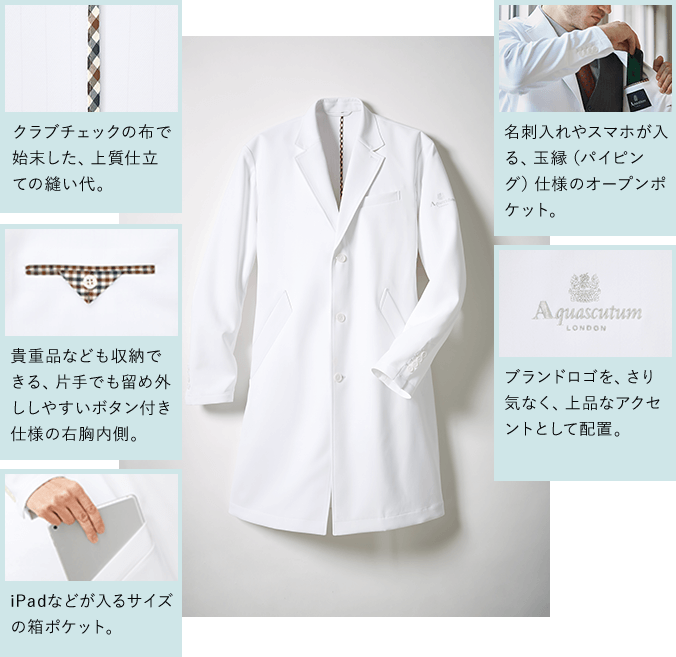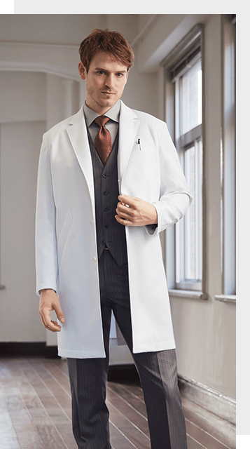 現場志向の高機能性を追求しました。機動力を重視し、品格を纏うショートレングスのドクターコートです。腕まくりしやすい〝袖口ボタン開き〟の本切羽仕様。フックなどに掛けられる、伝統的な仕様のハンガーループ付きです。