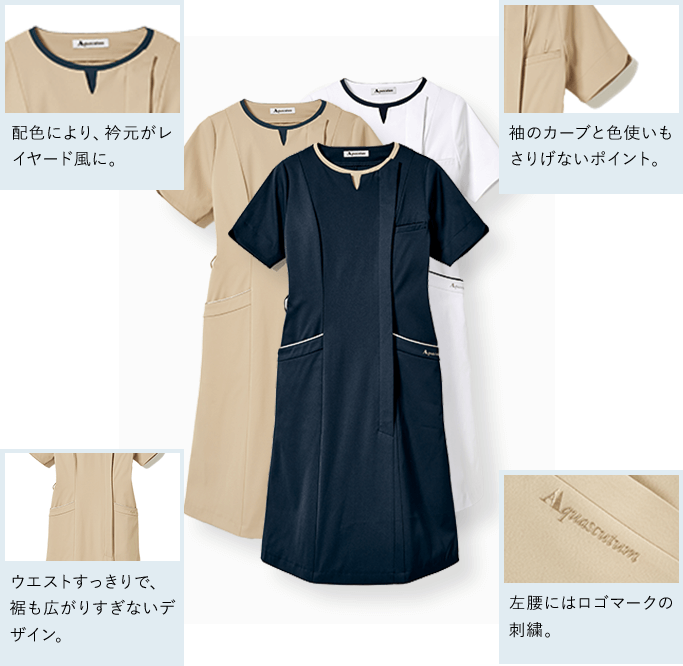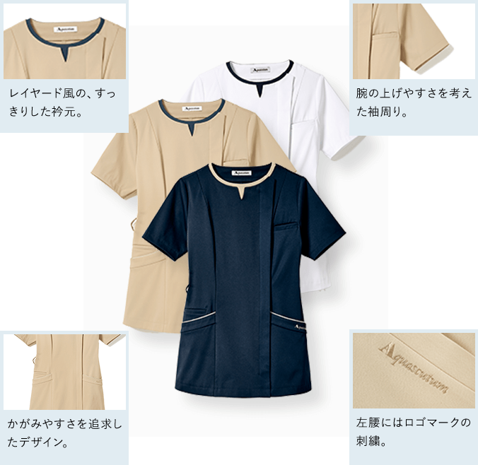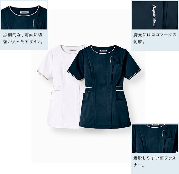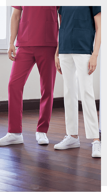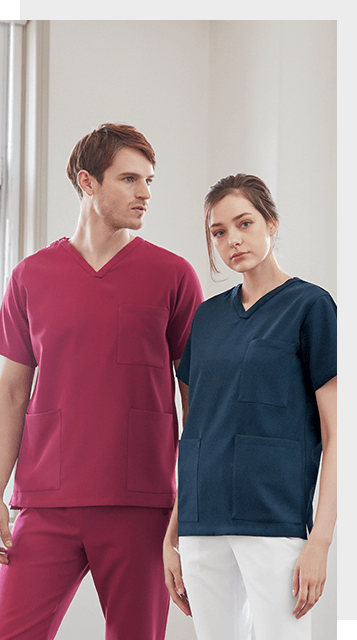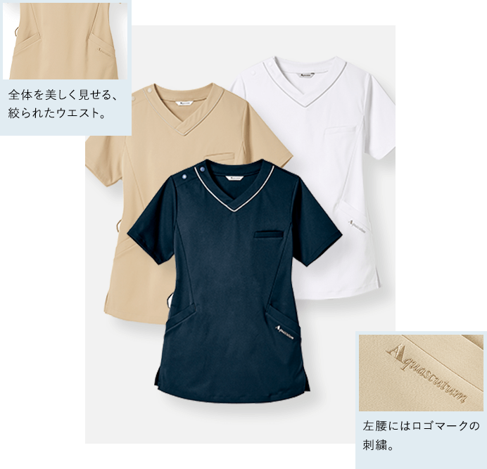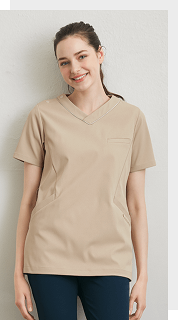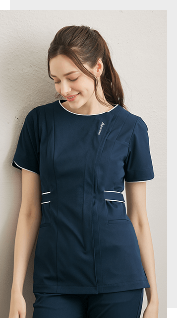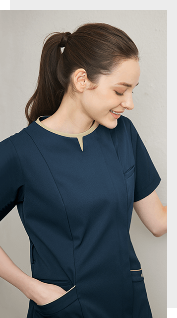 切替デザインのスクラブです。動きやすさと美しさとを兼ね備えたスクラブです。ウエストを程よく絞っているため、スッキリ感がただよいます。全体的に引き締まったシルエットが特長の、スタイルを良く見せてくれるスクラブです。