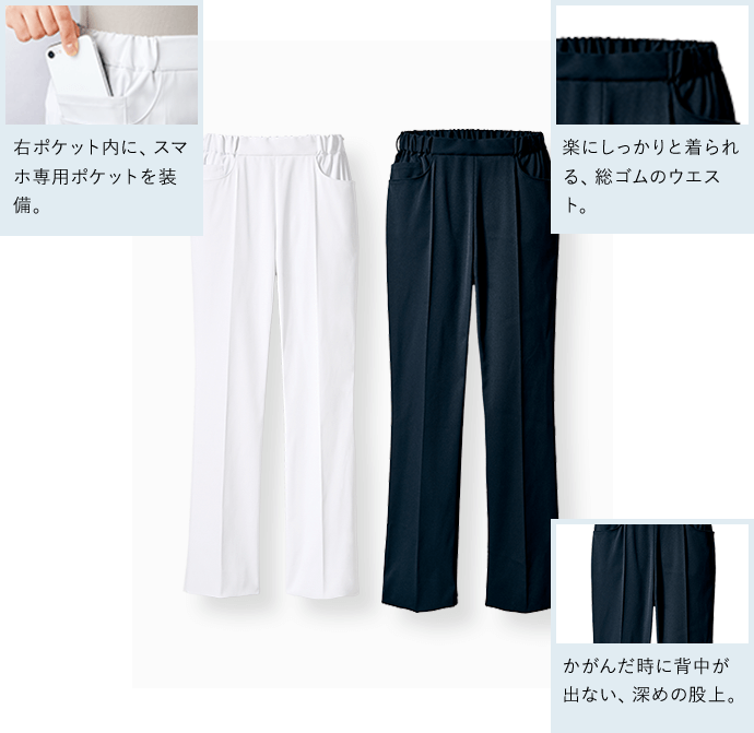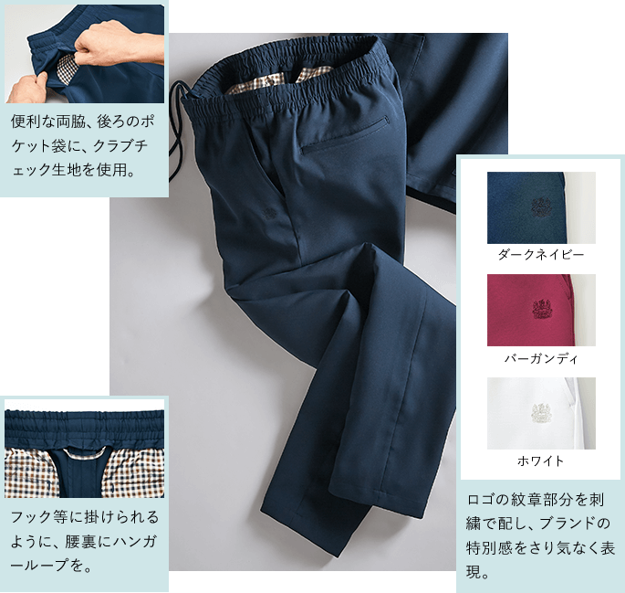 ●素材/ポリエステル100%(フルダル制電2重織ストレッチツイル)●ウエスト仕様/総ゴム・紐入り●裾始末/三つ折り●ポケット位置/両脇・後ろ左右●日本製ご購入はこちらから