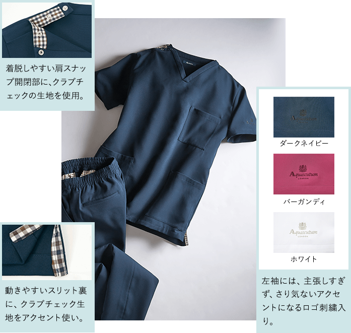 秘めた王道スタイルです。アクアスキュータムが開発したオリジナル・クラブチェックを、裏地に部分使い。ブランドの品格にふさわしい国産の二重織ストレッチ素材を使用し、スクラブの王道デザインに特別な価値を与えています。