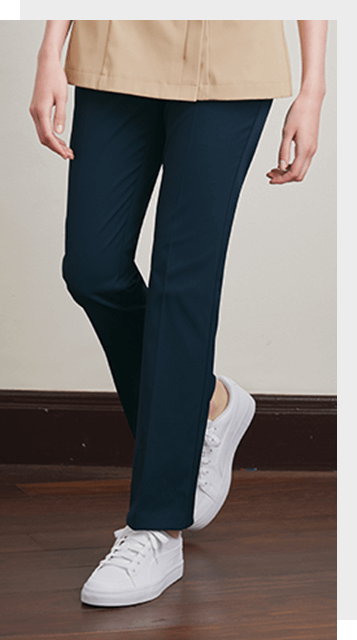 センタープレスで脚長に見えます。ストレッチ性があり、透け感も気にならない素材なので、動きやすさも安心感もOK! ひざ幅を少し絞って、裾をほんのり広くしているので、程よい美脚シルエットが演出できます。