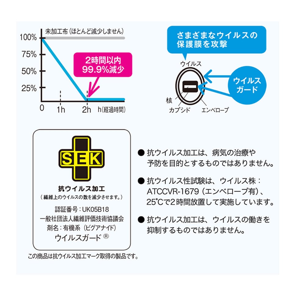 抗ウイルス加工の厳しい基準をクリアした高機能素材だから、ウイルスの増殖を抑制するのにも効果を発揮します。