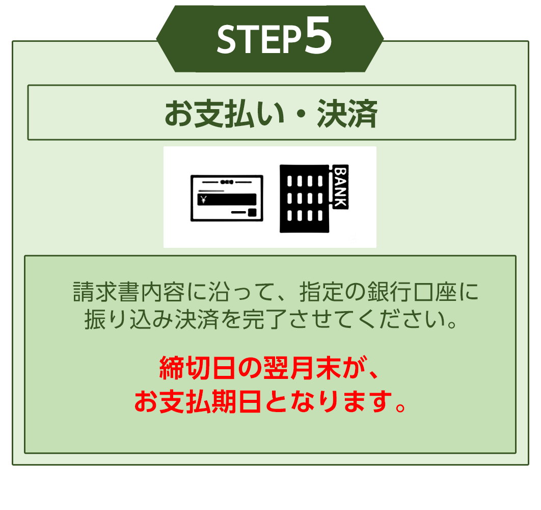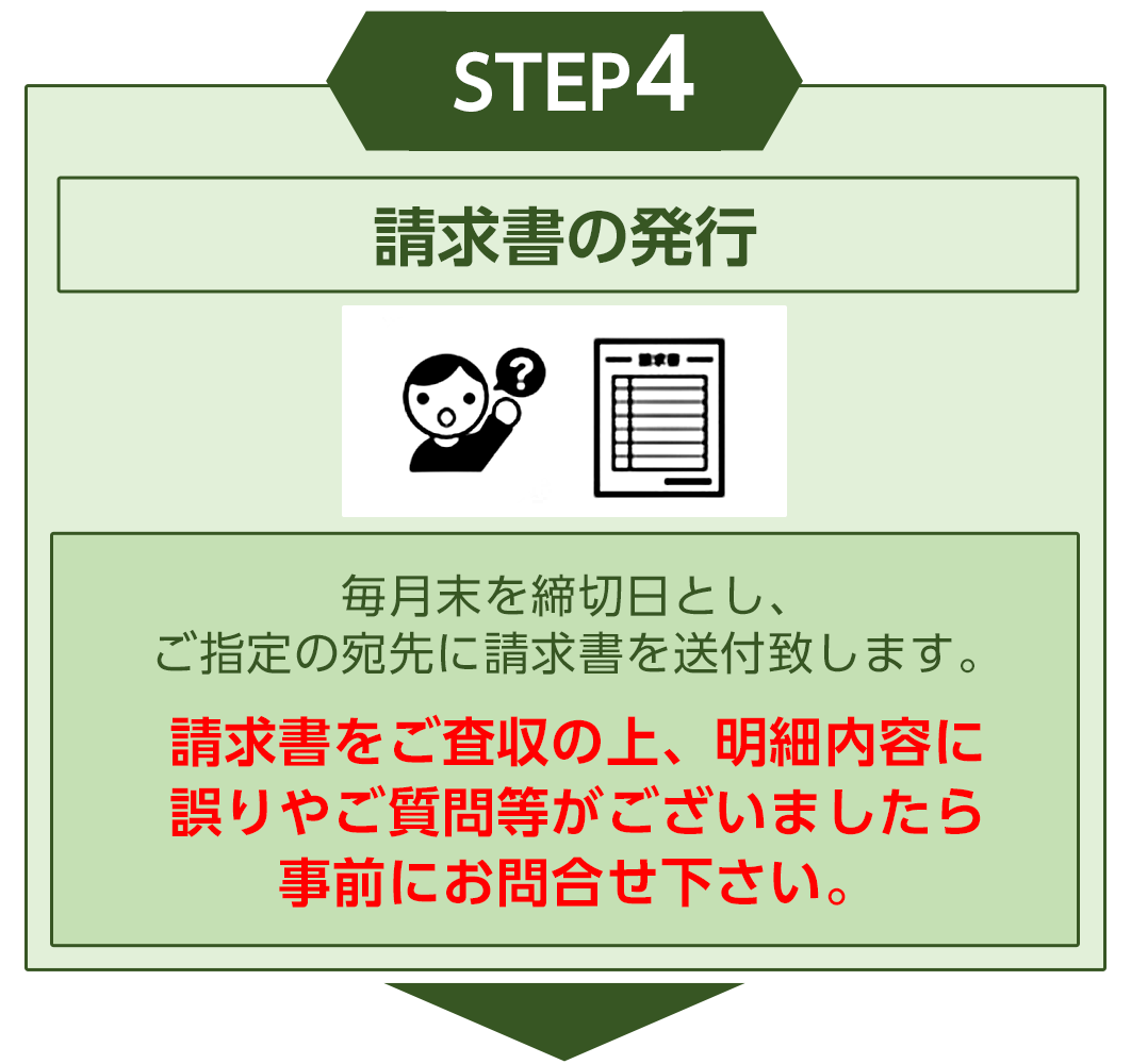 - ② お支払いは別途請求書を発行、まとめて後払いでOK(月末日締め/翌月末日払い)