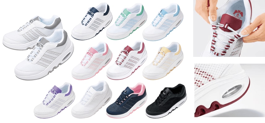 ローリング歩行が自然にできるよう計算されたカーブ形状の船底ソールを採用。かかと部分には、エアーを内蔵しているので、疲れの原因となる体圧や着地の衝撃を吸収し、膝や腰への負担を軽減してくれます。さらに脱ぎ履きだけでなく甲へのフィット感もラクで足を締め付けにくい、ゴムひも仕様。
