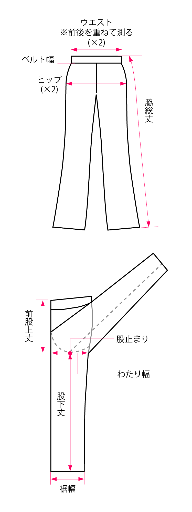 | ウエスト | 58~64 | 64~70 | 69~77 | 77~85 | 85~93 | 93~101 | 101~109 | |